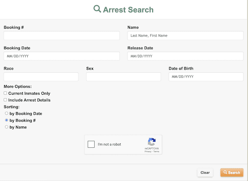 When you’re finished filling out the arrest inquiry form, click the Captcha box and then click the orange Search button.